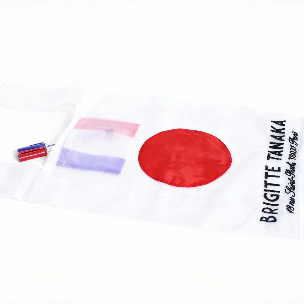 Ce sac, mettant en avant les nationalités de ses deux créatrices, est aussi ludique que fonctionnel. Les drapeaux japonais et français sont chacun conçus comme des poches individuelles, créant un détail audacieux et humoristique qui incarne parfaitement l’esprit BT.