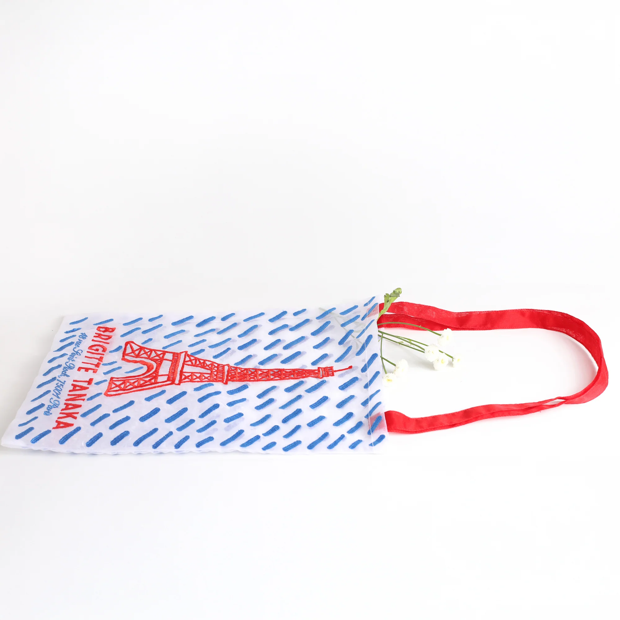 Brigitte Tanaka célèbre avec humour et finesse l’un des emblèmes les plus iconiques de Paris : la Tour Eiffel. Brodée en rouge éclatant sur un organza transparent orné de motifs bleus, cette pièce légère et réutilisable revisite le traditionnel tote-bag en lui insufflant une touche résolument parisienne.